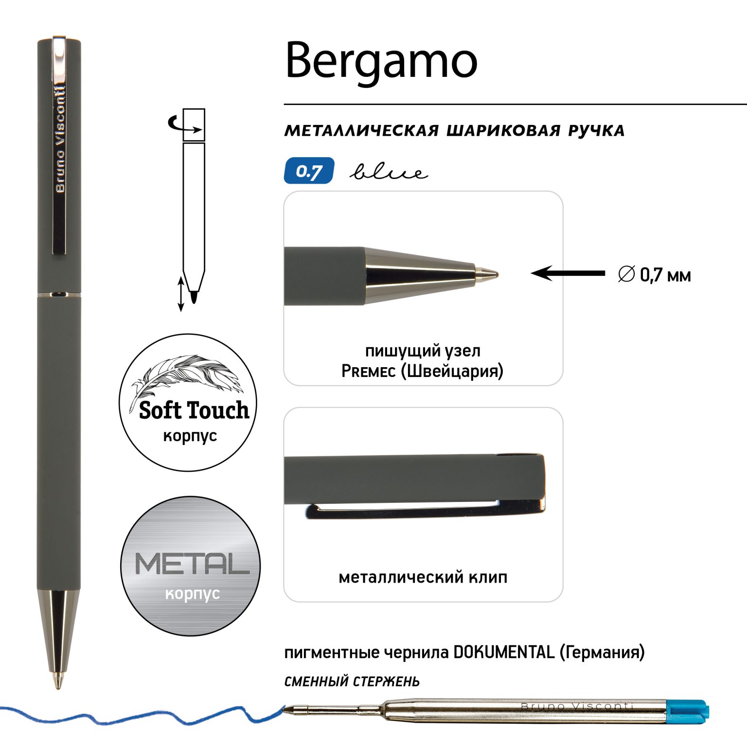 Корпус ручки — из металла с антискользящим бархатистым покрытием Soft Touch. Ручка автоматическая, с легким поворотным механизмом подачи стержня. Надежный пишущий узел d 0,7 мм (от швейцарского производителя Premec) гарантирует высокое качество так же, как и пигментные чернила Dokumental (Германия). Благодаря им писать ручкой «Bergamo» от «Bruno Visconti» одно удовольствие – она мягко скользит по поверхности бумаги, оставляя ровную, четкую линию.